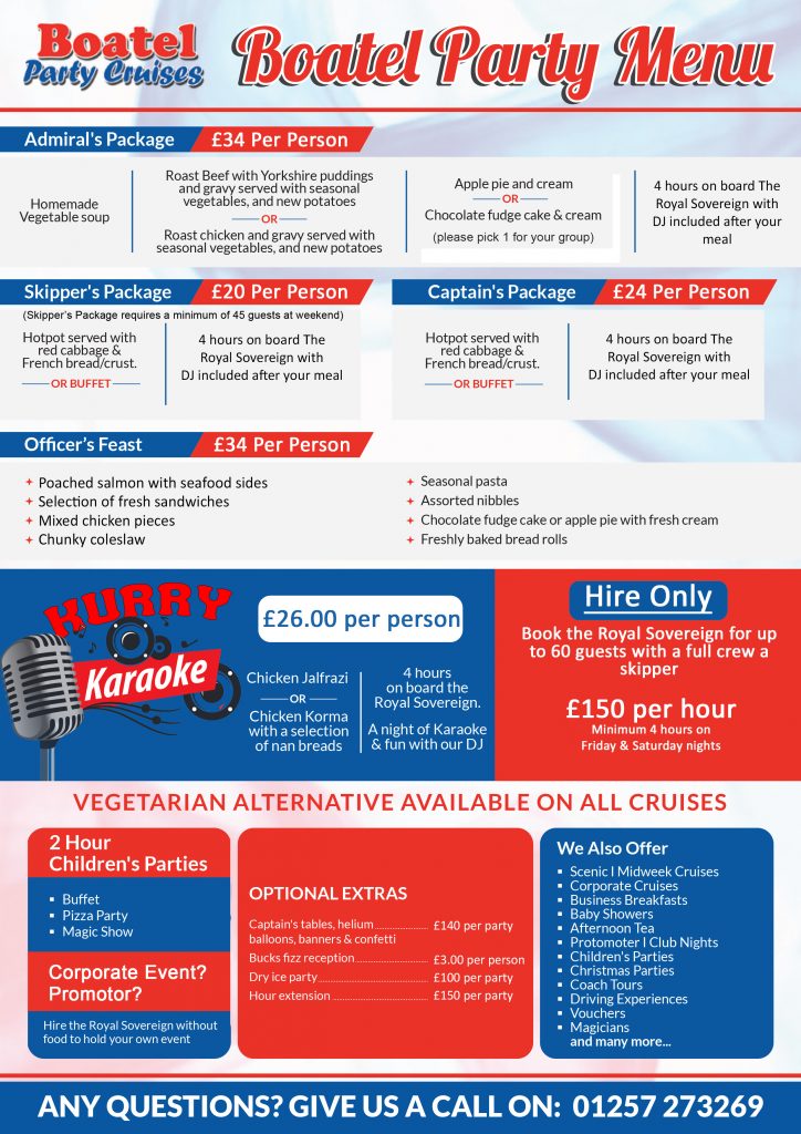 We also offer the Royal Sovereign for “Hire Only” for £150 per hour at weekends (minimum 4 hours on a Friday or Saturday night). Under our Hire Only option, it doesn’t matter if you bring 2 people or the full 60 as you are hiring the Royal Sovereign with full crew instead of paying per person. This would be private to just your group. This package does not include a DJ or food, but you are more than welcome to bring your own catering and you can use our sound system if you play your own music through Spotify etc. If you would like to add a DJ then this can be arranged for addition fee. Please contact us on 01257 273269 for more details.